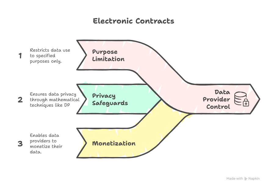 - Electronic Contracts: Code-enforced legal agreements between transacting parties, that give data providers control over how their data is used, for eg. through purpose limitation, privacy safeguards and monetization.